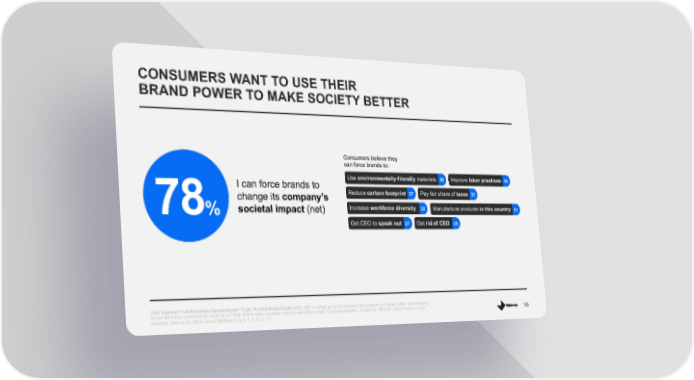 CONSUMERS WANT TO USE THEIR BRAND POWER TO MAKE SOCIETY BETTER Consumers believe they can force brands to: I can force brands to Use environmentally-friendly materials 39 Improve labor practices 38 change its company’s Reduce carbon footprint 37 Pay fair share of taxes 33 78% societal impact (net) Increase workforce diversity 32 Manufacture products in this country 31 Get CEO to speak out 27 Get rid of CEO 25 2021 Edelman Trust Barometer Special Report: Trust, The New Brand Equity. BRD_IMP. If a large group of consumers put pressure on a brand, which of the following do you think they could force the brand to do? Pick all that apply. Question asked of half of the sample. General population, 14-mkt avg. “All of the above” added to each 16 response. Data on the left is a net of attributes 3, 4, 5, 7, 8, 9, 10, 12.
