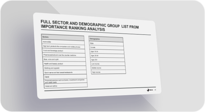 FULL SECTOR AND DEMOGRAPHIC GROUP LIST FROM IMPORTANCE RANKING ANALYSIS Sectors Demographics Automobile Male High tech products like computers and mobile phones Female Food and beverage product Ages 18-34 Pharmaceutical and over the counter medicine Ages 35-54 Beer, wine and spirit Ages 55+ Health and beauty product Low income Clothing and apparel Middle income Quick serve and fast casual restaurants High income Retail Financial services such as banks, investment companies and credit cards Hotel and airline 41