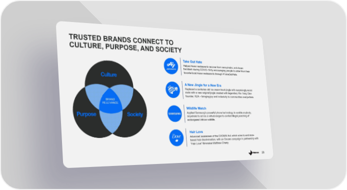 TRUSTED BRANDS CONNECT TO CULTURE, PURPOSE, AND SOCIETY Take Out Hate Helped Asian restaurants recover from xenophobic, anti-Asian backlash during COVID-19 by encouraging people to order from their Culture favorite local Asian restaurants through #TakeOutHate. A New Jingle for a New Era Replaced a centuries-old ice cream truck jingle with surprisingly racist roots with a new original jingle created with legendary Wu-Tang Clan founder, RZA – bringing joy and inclusivity to communities everywhere. BRAND RELEVANCE Wildlife Watch Purpose Society Applied Samsung’s powerful phone technology to enable anybody, anywhere to act as a virtual ranger to combat illegal poaching of endangered African wildlife. Hair Love Advanced awareness of the CROWN Act, which aims to end race- based hair discrimination, with an Oscars campaign in partnership with "Hair Love" filmmaker Matthew Cherry. 28