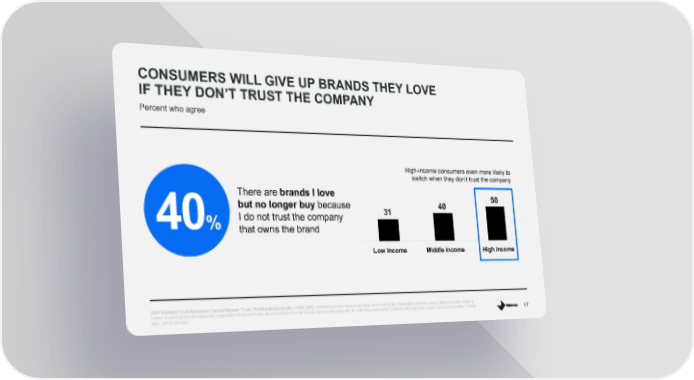 CONSUMERS WILL GIVE UP BRANDS THEY LOVE IF THEY DON’T TRUST THE COMPANY Percent who agree High-income consumers even more likely to switch when they don’t trust the company There are brands I love 50 but no longer buy because 31 40 40% I do not trust the company that owns the brand Low income Middle income High income 2021 Edelman Trust Barometer Special Report: Trust, The New Brand Equity. CORP_BRD. Individual product brands are often produced by big corporations that own many different brands. When it comes to product brands versus the corporations that own them, please indicate how much you agree or disagree with the following statements. 9-point scale; top 4 box, agree. General population, 14-mkt 17 avg., and by income.