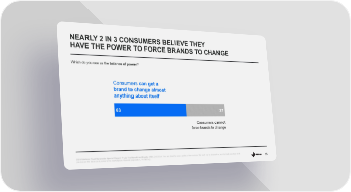 NEARLY 2 IN 3 CONSUMERS BELIEVE THEY HAVE THE POWER TO FORCE BRANDS TO CHANGE Which do you see as the balance of power? Consumers can get a brand to change almost anything about itself 63 37 Consumers cannot force brands to change 2021 Edelman Trust Barometer Special Report: Trust, The New Brand Equity. BRD_CHOICE4. You are about to see a series of two choices. We want you to choose the one that best describes what 15 you see as the balance of power in the marketplace. General population, 14-mkt avg.