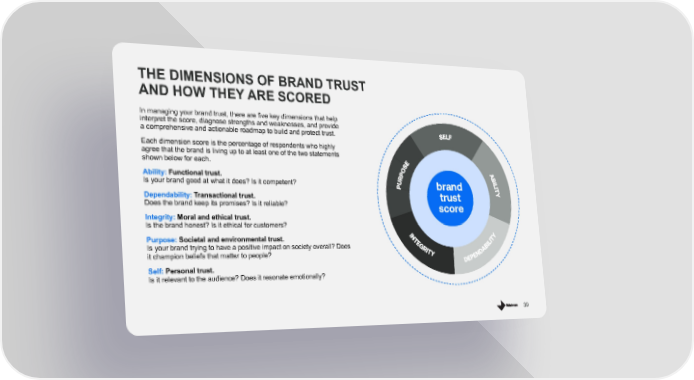 THE DIMENSIONS OF BRAND TRUST AND HOW THEY ARE SCORED In managing your brand trust, there are five key dimensions that help interpret the score, diagnose strengths and weaknesses, and provide a comprehensive and actionable roadmap to build and protect trust. Each dimension score is the percentage of respondents who highly agree that the brand is living up to at least one of the two statements shown below for each. Ability: Functional trust. Is your brand good at what it does? Is it competent? brand Dependability: Transactional trust. trust Does the brand keep its promises? Is it reliable? score Integrity: Moral and ethical trust. Is the brand honest? Is it ethical for customers? Purpose: Societal and environmental trust. Is your brand trying to have a positive impact on society overall? Does it champion beliefs that matter to people? Self: Personal trust. Is it relevant to the audience? Does it resonate emotionally? 39